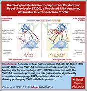 Rondaptivon pegol (previously BT200) is a pegylated RNA aptamer that binds to the A1 domain of von Willebrand factor (VWF) and increases plasma VWF factor VIII levels. Chion et al demonstrate that BT200 binding to VWF prolongs VWF half-life by attenuating macrophage-mediated clearance through decreasing binding to macrophage lipoprotein receptor–related protein 1 and decreasing uptake. These studies suggest a novel approach to treating von Willebrand disease and hemophilia through agents targeting inhibition of VWF clearance.
