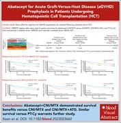 Kean et al report on a retrospective study comparing abatacept/calcineurin inhibitors/methotrexate (A/CNI/MTX) vs CNI/MTX, CNI/MTX plus antithymocyte globulin (ATG), and cyclophosphamide-based prophylaxis (PT-Cy) for acute graft-versus-host disease prophylaxis for 7/8 HLA-mismatched unrelated donor (MMUD) or 8/8 HLA-matched unrelated donor (MUD) transplants. Two-year relapse-free survival (RFS) was significantly higher for MMUD recipients treated with A/CNI/MTX vs CN/MTX and CNI/MTX plus ATG but was similar to PT-Cy. For 8/8 MUD recipients, although RFS was numerically higher with A/CNI/MTX, results were not statistically significant.