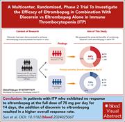 Sun et al report results of a phase 2 trial of eltrombopag plus diacerein, an anthraquinone anti-inflammatory drug, vs eltrombopag alone in patients with immune thrombocytopenia (ITP) unresponsive to 14 days of eltrombopag treatment. Overall response rate (44% vs 12%, respectively) and duration of response were improved with the addition of diacerein, although both arms lost response over time. This suggests that the addition of diacerein may improve short-term responses for patients with ITP resistant to eltrombopag.