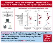Patients with NPM1-mutated (NPM1mut) acute myeloid leukemia (AML) have a favorable prognosis, but relapses occur in up to 50% of patients. Postinduction measurable residual disease (MRD) predicts outcome, as do FLT3 internal tandem duplication and adverse cytogenetics. Othman and colleagues studied 1357 patients with NPM1mut AML in 2 large prospective trials to assess the impact of baseline clinical and molecular features, postinduction MRD, and treatment intensity on outcomes. The authors report secondary mutations associated with worse outcome but cannot identify a particular subgroup, except for patients with adverse cytogenetics, that benefits from allografting in first remission.