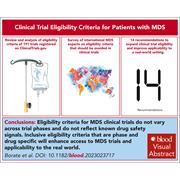 Overly stringent eligibility criteria can impede patient accrual in clinical trials, particularly in diseases where patients are older and more likely to have comorbidities. Borate et al, on behalf of the International Consortium for Myelodysplastic Syndromes (icMDS), examined trial eligibility for patients with MDS and found that exclusion criteria in most trials were often unrelated to drug safety concerns. After a Delphi process among MDS experts, the authors present practical guidelines for designing more inclusive and drug-specific eligibility criteria, which should enhance patient access to MDS trials.