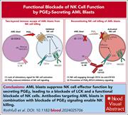 Natural killer (NK) cells reconstitute early after allogeneic hematopoietic stem cell transplantation and play a crucial role in the graft-versus-leukemia effect against acute myeloid leukemia (AML). Rothfuß et al investigated mechanisms of immune escape and found that AML blasts secrete prostaglandin E2 (PGE2), which functionally impairs NK cells by inhibiting lymphocyte-specific protein tyrosine kinase–dependent activation. Notably, blockade of PGE2 signaling restores NK cell cytotoxicity, raising the possibility of integrating pharmacological strategies targeting this axis with NK cell–based therapies to enhance anti-AML immune responses.