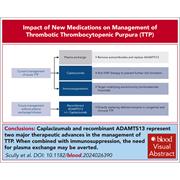 In recent years, 2 new therapies have been approved for thrombotic thrombocytopenic purpura (TTP): caplacizumab for immune TTP and recombinant ADAMTS13 for congenital TTP. In this Blood Spotlight, Scully et al review the potential impact of these treatments in improving acute TTP outcomes, reducing the need for plasma therapy and shortening the time to clinical response.