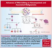 Adenosine-to-inosine RNA editing is a posttranscriptional modification mediated by adenosine deaminase acting on RNA (ADAR) enzymes that converts adenosines to inosines in both coding and noncoding RNA transcripts, thereby influencing the function of a wide range of RNAs. Pu et al provide a comprehensive review of recent studies showing a crucial role for this process in hematopoietic cell development and hematologic malignancy progression. The authors also explore the therapeutic potential of targeting ADAR expression and specific RNA substrates.