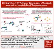 Heparin-induced thrombocytopenia (HIT) is initiated by antibodies that recognize large antigenic complexes formed by multiple cationic platelet factor 4 (PF4) molecules and polyanions such as unfractionated heparin. Rauova et al demonstrate in a murine model of HIT that universal heparin reversal agents (UHRAs) inhibit the formation of ultralarge immune complexes, dissociate preformed complexes, and suppress thrombosis. These findings support further investigation of UHRAs as a potential new therapeutic approach for HIT.