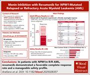 Relapsed/refractory (R/R) nucleophosmin 1 (NPM1)–mutated acute myeloid leukemia (AML) has a generally favorable prognosis, but relapse remains a significant therapeutic challenge. Arellano and colleagues report the results of the phase 2 AUGMENT trial, which evaluated the menin inhibitor revumenib in heavily pretreated patients with relapsed AML who were largely preexposed to venetoclax. They observed an overall response rate of 47%, with patients with concomitant IDH1 or IDH2 mutations experiencing the best results. These promising results require confirmation in large phase 3 trials.