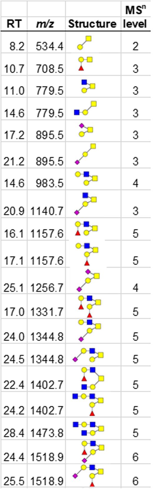 Proposed structures were shown as cartoon representations of glycans identified by MSn analyses. The m/z value at which each glycan was detected is given as the sodiated ion of permethylated glycan. Theor Mass, theoretical mass.