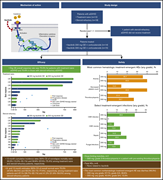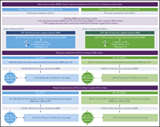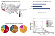 Geographic prevalence of blood product recalls in the United States. Normalized county-level prevalence was estimated by using recall-event density, defined as the number of recall events originating in a county divided by the number of blood product establishments in that county. Counties in blue have no recall events, and counties in red have a recall-event density proportional to the shading intensity. Regions in white do not have blood product establishments. The images in circles are snippets of recalled blood product distribution (top) and recall-event likelihood (bottom). See the article by Alqemlas et al. - PDF Icon Front MatterFront Matter