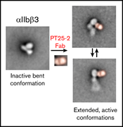 Cryo-electron microscopy density map of the αIIbβ3 headpiece in complex with the Fab fragment of activating monoclonal antibody PT25-2 (only the variable domains are shown) at a resolution of 3.3 Å. The map is segmented and colored according to the individual polypeptide chains. The asterisk indicates the ligand-binding site. See the article by Nešić et al. - PDF Icon Front MatterFront Matter