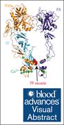 Molecular dynamics simulation of the membrane-bound enzyme that triggers blood clotting (tissue factor is shown in blue and factor VIIa in orange) bound to its favored substrate, factor X (purple). The proteins are assembled on a phospholipid bilayer. See the article by Muller et al.