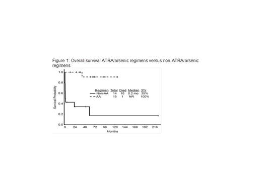 Among the 29 pts, 13 (45%) were male and median age at presentation was 48 years (29 - 77). Thirteen pts (45%) had the microgranular variant of APL. Karyotype analysis was available in 23 pts (79.3%). All 23 pts harbored the t(15:17)(q22; q21). Additional cytogenetic abnormalities involved chromosome 9 in 3 (10%), chromosome 21 in 2 (7%) and others in 6 (18%) each. Median PML-RARA transcript value was 24.0 (0.13 - 42.7). FLT3 analysis was performed in 11 pts presenting after 2003 with 100% having FLT3-internal tandem duplication and one having both FLT3-ITD and FLT3-tyrosine kinase domain mutations. No RAS or c-KIT mutations identified. Median WBC count, peripheral promyelocyte percentage, hemoglobin and platelet count at presentation were 85.5 x 109/L (53.8 - 194.8), 86.5% (0 - 97), 9.60 g/dL (7.7 - 12.8), and 25 x 109/L (10 - 124), respectively. Median bone marrow (BM) cellularity, BM promyelocyte, and BM blasts at presentation were 95% (75 - 100), 82% (0 - 90), and 5% (0 - 97), respectively. 23 (79%) pts had clinical evidence of leucostasis at presentation including hypoxia in 10 (34%), hemoptysis or diffuse alveolar hemorrhage in 6 (21%), stroke or intracranial bleeding in 4 (14%), intraocular bleeding in 4 (14%), and gastrointestinal bleeding in 4 (14%). Chemical DIC seen in 27 pts (93%) with median fibrinogen of 243 mg/dL (125 - 662), median PT of 16.6 seconds (12.6 - 24.2), median PTT of 25 seconds (21.0 - 33.8) and median INR of 2.21 (1.56 - 2.95). Treatment regimens included all-trans retinoic acid (ATRA)/arsenic trioxide (ATO) combinations in 15 (52%) patients including ATRA+ ATO in 4 (14%) and ATRA+ATO+GO (gemtuzumab ozogamicin) in 11 (38%). Non-ATRA/ATO regimens were used in 14 (48%) patients including ATRA+idarubicin (IDA) in 8 (27%), ATRA+GO in 4 (14%), and ATRA+IDA+GO in 2 (7%), respectively. Leukapheresis was performed in 11 pts (38%) with a median of 3 leukapheresis procedures (1 - 6). Median WBC at initiation and completion of leukapheresis were 106.0 (80.2 - 194.8) and 26.1 (1.7 - 35.9), respectively. 6 pts died within 4-weeks of initiating therapy. All remaining 23 pts achieved morphological complete remission (CR) after induction with median time to CR of 21.5 days (15 - 35). 6 pts relapsed and 5 achieved a second CR with salvage regimens including allogeneic transplant in 2 pts. Median OS for the entire group is 67 months. CR rate and 3-year overall survival (OS) for the pts who underwent leukapheresis were 82% and 73% versus 78% and 67% for those who did not receive leukapheresis (P=0.79 and P=0.64; respectively). CR rate and 3-year OS for the pts treated with ATRA/ATO combinations were 100% and 100% versus 57% and 35% for those treated with non-ATRA/ATO combinations (P=0.004 and P=0.002, respectively).
