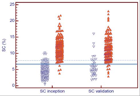 | Cohort . | SC % . | Sensitivity (%) . | Specificity (%) . | LR+ . | LR- . |